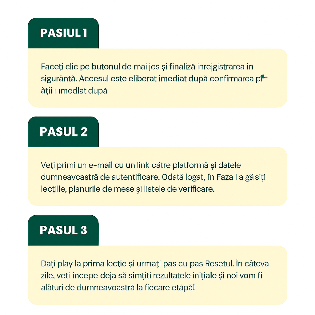 E în regulă! RESET nu înseamnă perfecțiune; ci progres real și constant. Dacă în orice moment nu poți urma 100%, nu renunța. Revino a doua zi cu o remarcă ușoară; ceea ce contează este menținerea angajamentului față de sănătatea ta. De fapt, materialele au fost concepute pentru asta: poți asculta cartea audio, poți revedea meniul, îți poți adapta mesele și poți continua în ritmul tău, fără vinovăție. Important este să continui. Pentru că fiecare pas pe care îl faci, oricât de mic, este deja o victorie pentru instinctul tău, energia ta și bunăstarea ta. Accesul este acordat timp de 1 an, așa că poți face totul în ritmul tău. Important este să nu te oprești și să continui să mergi înainte, chiar dacă este puțin câte puțin.